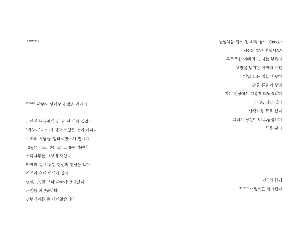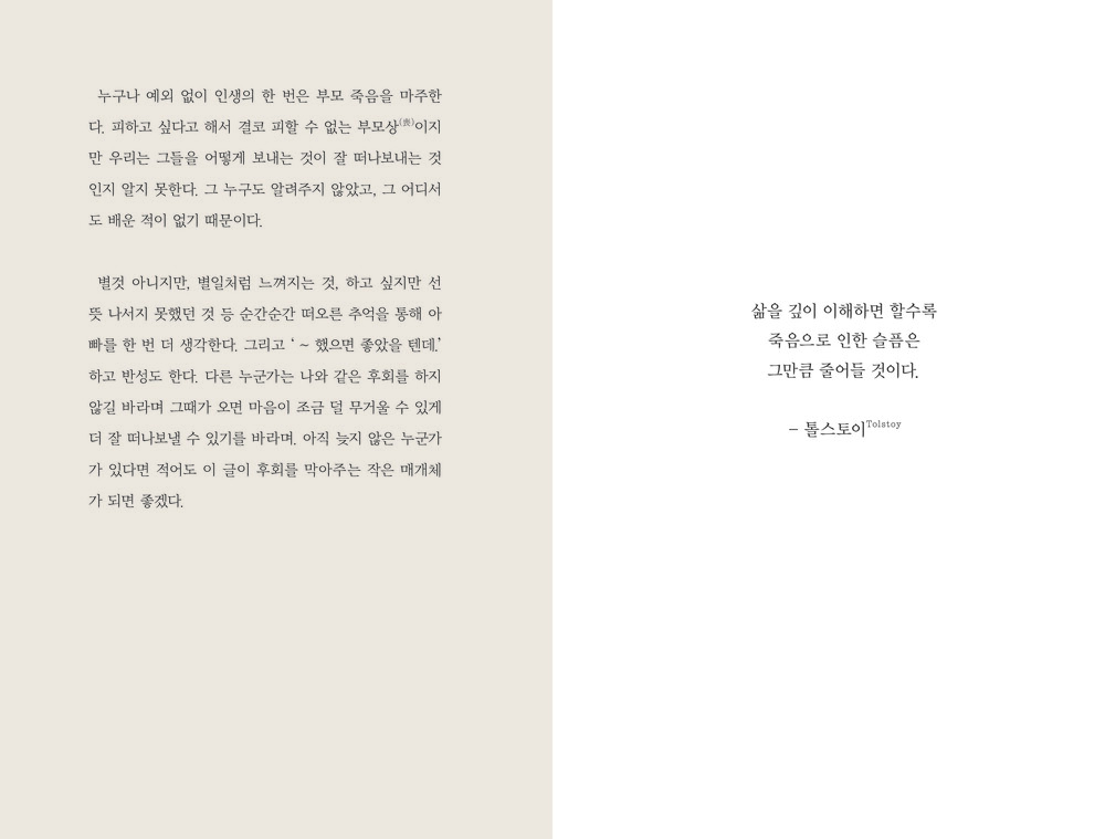 피하고 싶다 해서 피할 수 있는 것이 아닌 부모상(喪). 그때 조금이라도 덜 후회하기 위해 우리는 조금씩 노력하며 살아야 한다. 그 노력은 일상 속 관계에서 충분히 할 수 있다. 나에게 후회로 다가오는 순간이지만, 누군가에게 늦지 않았으면 하는 순간. 죽음을 앞둔 사람에게 삶을 정리할 시간이 필요하듯, 남아야 하는 사람에게도 떠나보낼 준비와 남겨질 상황에 대한 준비가 필요하지 않을까? 떠날 사람을 더 잘 보낼 수 있는, 남은 사람은 더 잘 살아낼 수 있는 아무도 알려주지 않은 부모 혹은 가족상(喪) 그 이후 이야기