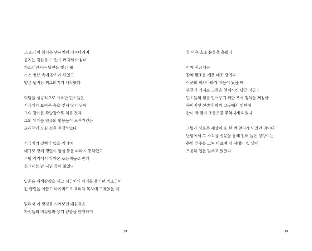 요리사로의 업을 가지고, 음악과 글을 지으며 창작활동을 이어가고 있습니다. 독립출판 그림책 ‘피고지고’의 글을 쓰기도 했습니다.